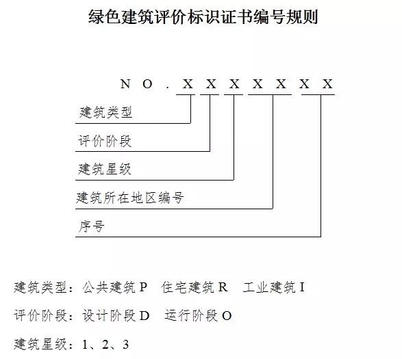 各评价机构颁发的标识、证书应保持统一,原有式样不变,但住房城乡建设部不再对绿色建筑标识证书统一编号,各地可以以本通知所附的编号规则(详见下图)为参考自行为标识证书编号。